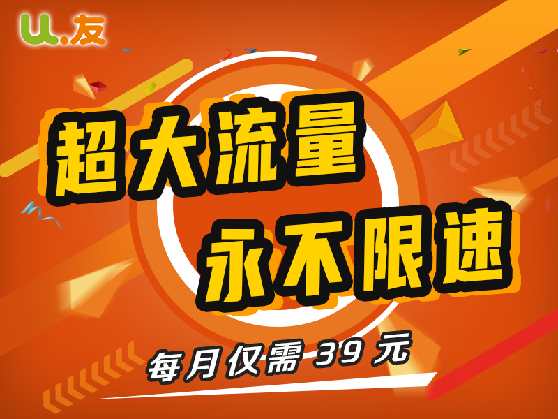 U友是工信部办法执照的民营运营商,U友致力于为用户提供最优质的产品、有专业的服务,U友分析市场需求,根据众多对于流量需求大的用户定制化的推出了超级流量卡,每月39元100G,让广大用户上网变得更加便捷,而且100G均为不限速、通用流量,这也是市场上极少出性价比极高的流量产品。