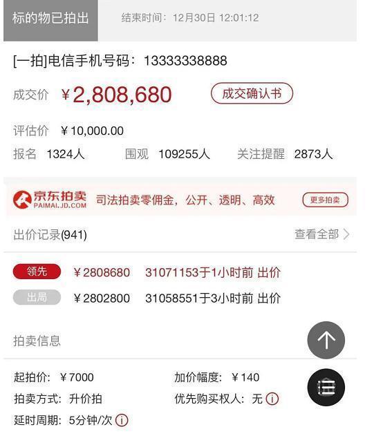 最近有网友曝光,一个归属地为秦皇岛的手机靓号在某平台进行网络拍卖,起初的评估价为1万元,感觉已经很高了是不是?但是最后的成交价竟飙升至280多万,让人瞠目结舌。