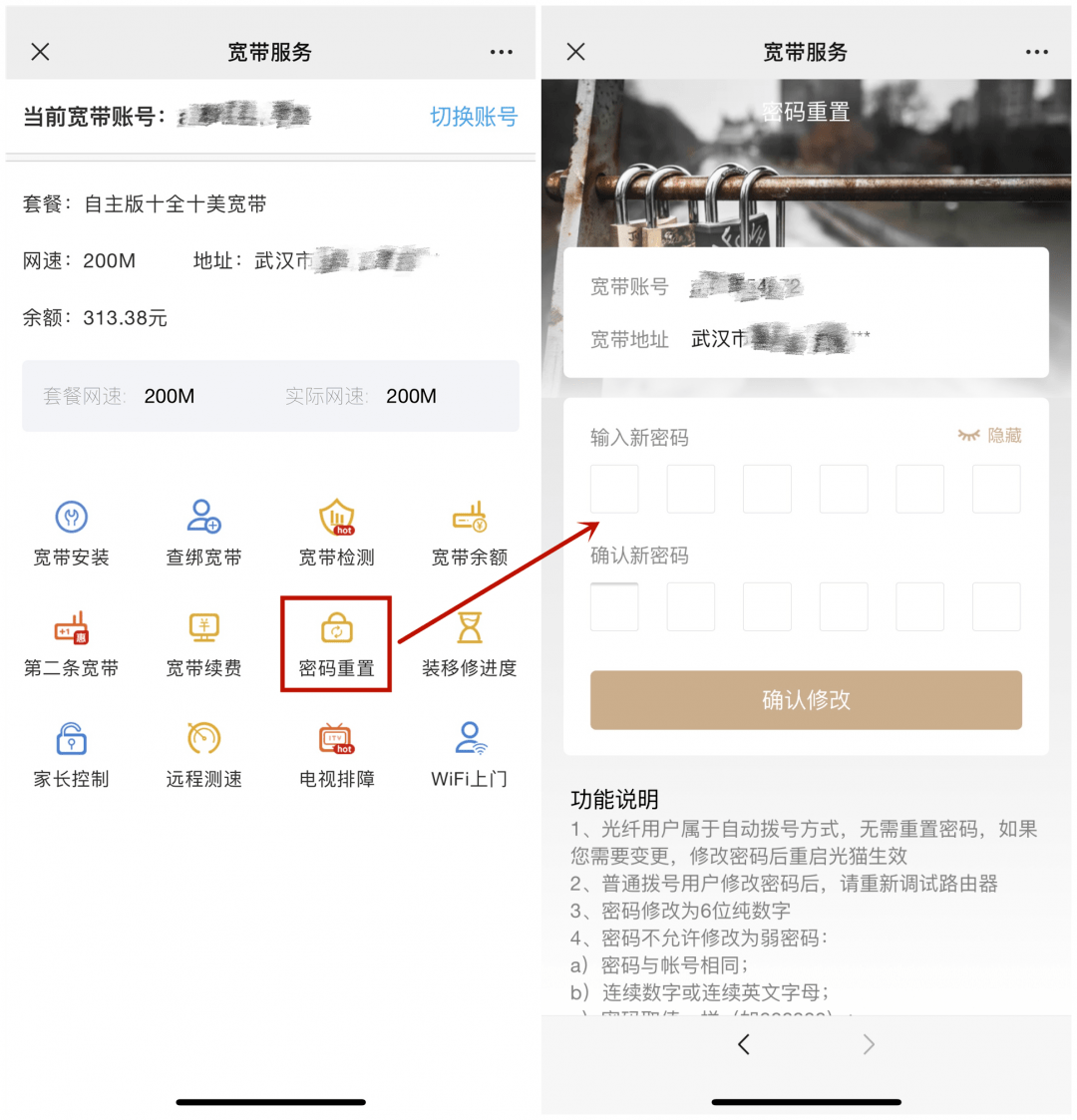 1、光纤用户属于自动拨号方式,无需重置密码,如果您需要变更,修改密码后重启光猫生效