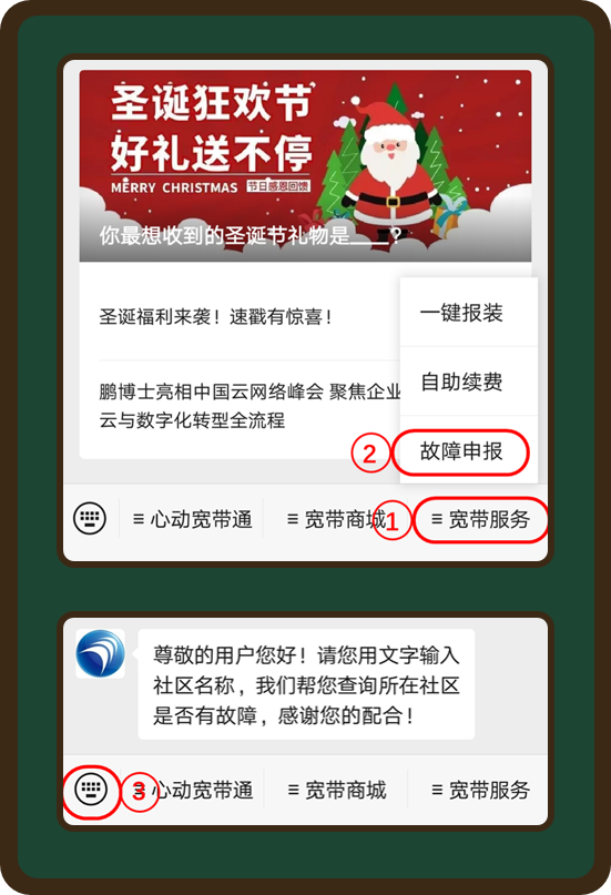 “北京宽带通”公众号——菜单栏【宽带服务】——【故障申报】——根据提示输入问题